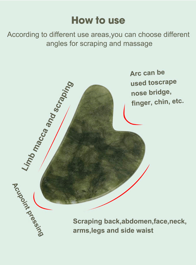 Χρησιμοποιείτε το GuaSha σε καθαρό δέρμα καθημερινά για 3-5 λεπτά. Εφαρμόστε λάδι ή ορό για να δώσετε στο δέρμα σας την απαραίτητη λίπανση για μασάζ. Επαναλάβετε κάθε κίνηση 5 φορές και κάντε κάθε πλευρά του προσώπου ξεχωριστά για μέγιστο όφελος. Θα πρέπει να χρησιμοποιείται με ελαφριά πίεση στο πρόσωπο. Η κίνηση να γίνεται από μέσα προς τα έξω & από κάτω προς τα πάνω. Πηγαίνετε πολύ απαλά γύρω από τα μάτια.