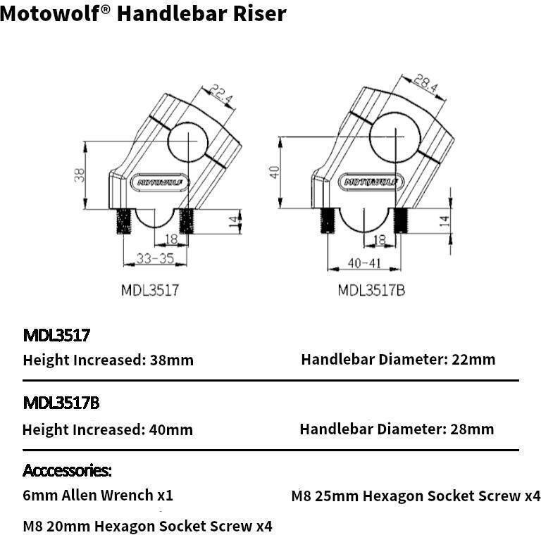 Σετ αποστάτες ανύψωσης τιμονιού μοτοσυκλέτας Motowolf κατάλληλα για τοποθέτηση πάνω από τα καβαλέτα της μοτοσυκλέτας σας, ώστε να μπορείτε να προσαρμόσετε το τιμόνι σας...